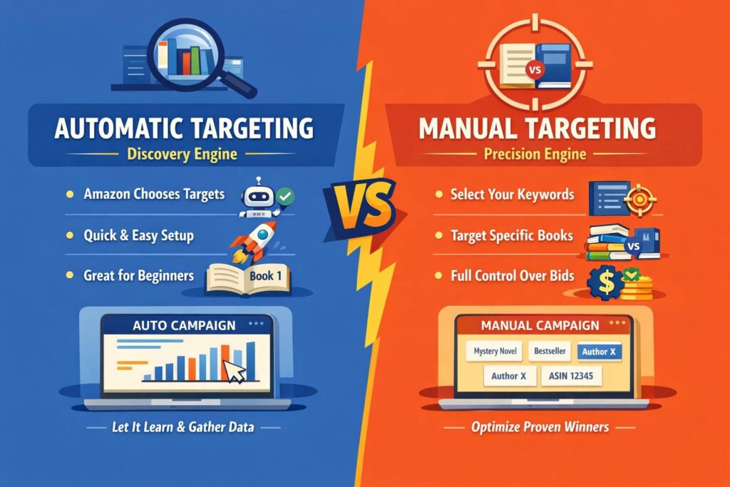 Start with both. Automatic targeting helps you discover how Amazon matches your book to readers. Manual targeting gives you control once you see what works. Together, they create balance.