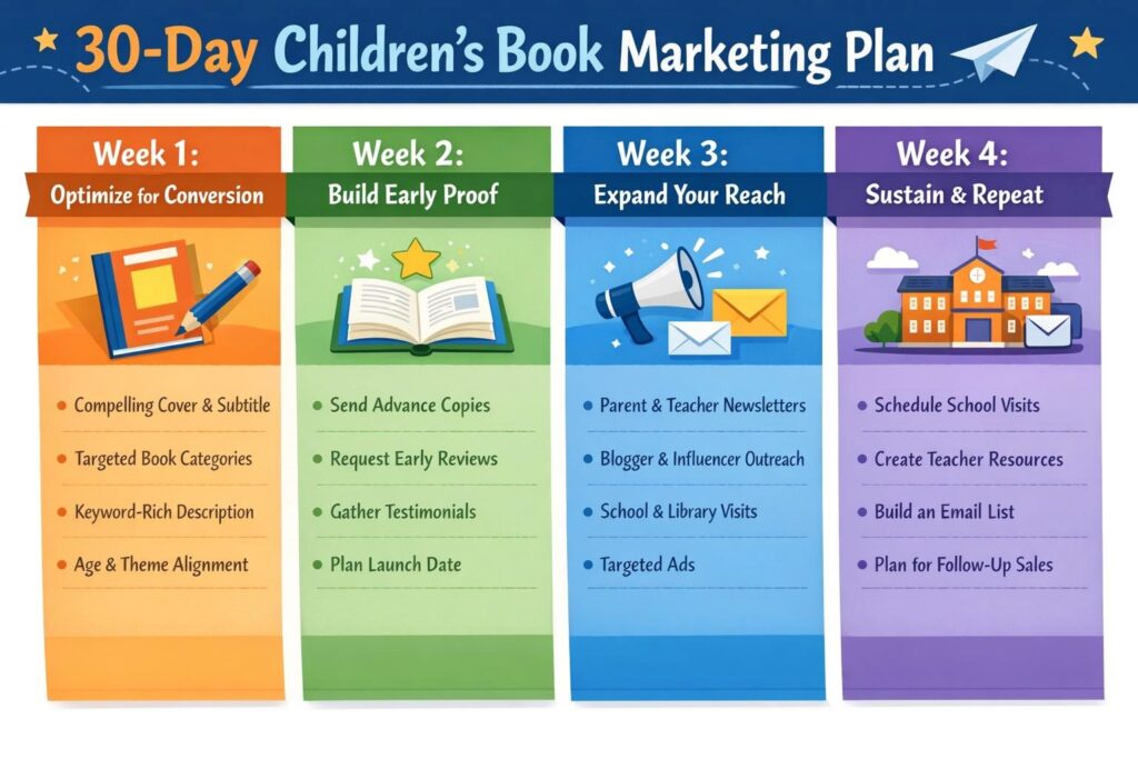 Week 4 is about repeatability. A children’s book that sells steadily is usually attached to a repeatable channel: school visits, educator resources, a themed email list, or a series angle that encourages the next purchase.
