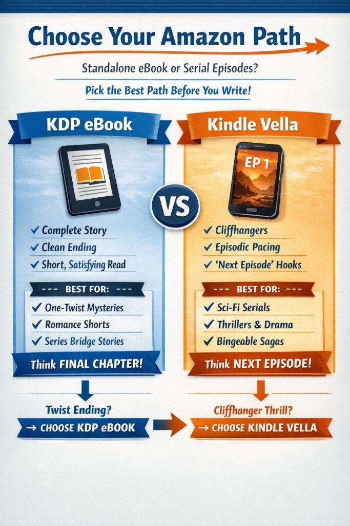 Use Kindle Vella when the story naturally breaks into episodes and benefits from cliffhangers or ongoing tension. If the concept thrives on “just one more episode,” Vella is usually the better fit.