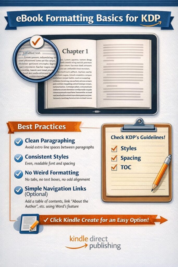 Kindle readers expect clean paragraphs, consistent spacing, and readable font flow. Avoid extra line breaks, forced spacing, or manual indentation. These shortcuts often break across devices and create an uneven reading experience.