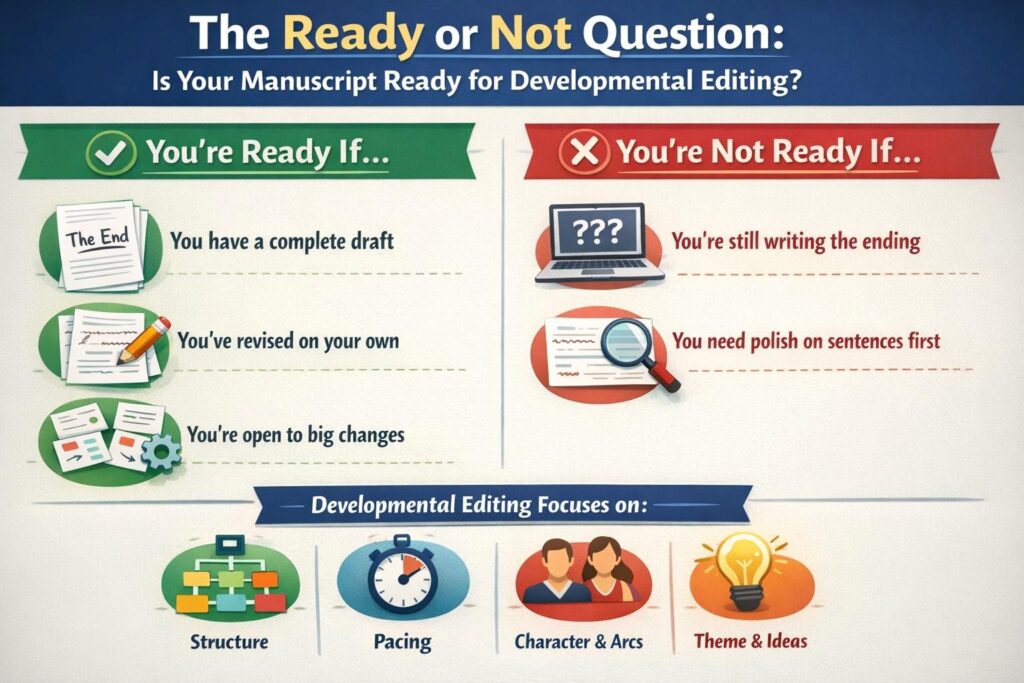 Here is the truth. Ready does not mean perfect. It means stable enough to benefit from honest, high level feedback. In this guide, you will learn how to tell when your manuscript has reached that point, what developmental editing really does, and how to step into the process with clarity instead of panic.
