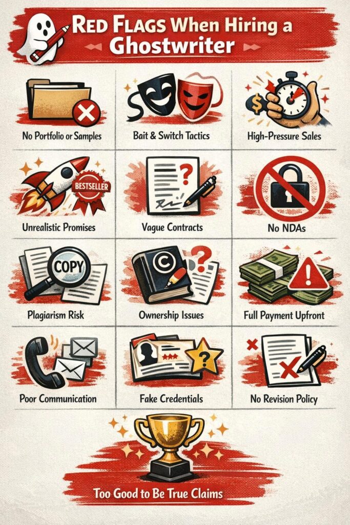 These are legitimate red flags when hiring a ghostwriter, but they are about fit. Not fraud.