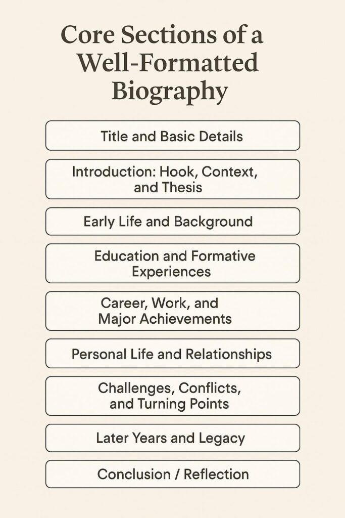 The good news is that biography structure is highly standardized. Whether you’re writing a school assignment, a college essay, or a book-length project, the core format stays almost the same: introduce the subject, establish early life, move through education and career, highlight key achievements and challenges, then close with impact or legacy.