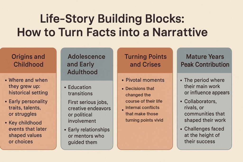 A biography is more than a list of events. It is a story shaped by themes and major shifts. Themes could include courage, creativity, leadership, loss, identity, or reinvention. Turning points are moments when the person made a choice or faced an event that changed their path. These could be breakthroughs, failures, moves to new places, new relationships, or sudden opportunities. When you identify these moments early, you understand the emotional arc of the biography.