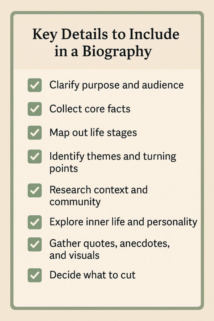 A strong biography does not start with writing. It starts with gathering, sorting, and understanding information with intention. A good checklist gives you direction, keeps you focused, and makes it easier to see what to include in a biography without drowning in unnecessary details. This expanded guide walks you through each step so you can move from scattered notes to a clear and compelling life story.